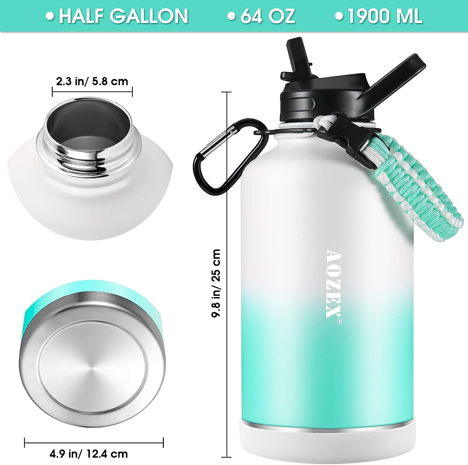 64 OZ Insulated Water Bottle with Straw, Stainless Steel Half Gallon Large Water
