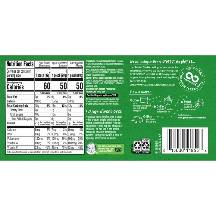 Gerber 2nd Foods Organic Baby Food, Variety Pack Fruit and Veggie Favorites is a delicious combination of fruits and veggie puree pouches that make feeding time easy. Made with produce that meets Gerber’s high-quality standards, this non-GMO, USDA Gerber Organic baby food stage 2 recipe variety pack includes 3 Pear Peach Strawberry pouches, 3 Apple Blueberry Spinach pouches, and 3 Carrot Apple Mango pouches for tantalizing combinations that have no artificial colors or flavors. Each baby food pouch contains 45% daily value of vitamin C. Gerber 2nd Foods help expose babies to a variety of tastes and ingredient combinations. These BPA-free baby food pouches make on-the-go baby meals easy. Refrigerate leftovers for two days. The health and safety of your little one has been and will always be Gerber’s highest priority. We're a leader in infant nutrition, not just because we grow food that will feed your little one, but also because we know what nourishment your little one needs.