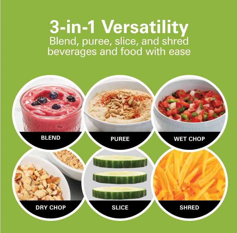 The versatile Hamilton Beach Multi Blend Kitchen System does the work of 3 separate appliances: a traditional kitchen blender, a food processor, and a personal blender. It has a powerful motor with 800 watts of peak power that crushes ice, blends, mixes, chops, slices, shreds and more. A single Multi Blend Blade System handles all your blending and food processing needs. Just choose the right attachment: the 52 oz. glass Multi Blend Jar, the 20 oz. personal jar for single-serve smoothies and shakes, or the food processor attachment with an included slicing and shredding disc. Use the 52 oz. glass blending jar with drip-free pouring spout to make a batch of milkshakes or to puree fresh pasta sauce. Or, swap the jar for the 3-cup food processor attachment to chop vegetables or mince garlic for a stir fry; it includes a chute and food pusher to make adding foods easy. The single-serve 20 oz. travel jar is perfect for morning smoothies when you're in a hurry. It's BPA free and includes a leak-proof lid for drinking on the go. Designed for quieter blending, the Hamilton Beach? Multi Blend Kitchen System is easy to operate, with all the power you need and simple controls.