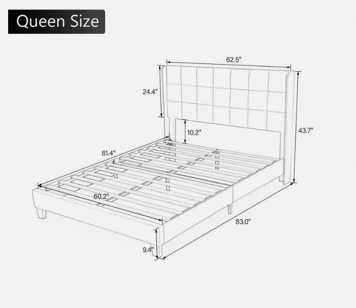 Queen size Platform Bed With Wingback Headboard, Square Stitched Style Dark Grey