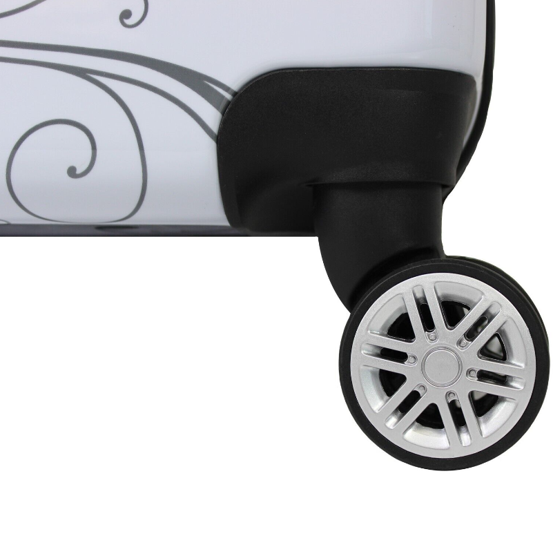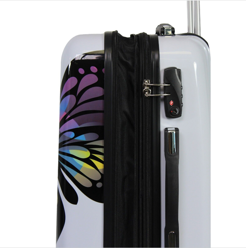 A unique butterfly emblazoned design and a dynamic exterior boasts a tough hardside construction that handles travel with grace and ease, while opening to reveal a fully stocked and versatile interior with garment restraints, accessory pockets, zipper pockets and more. Sitting confidently on 8 spinner wheels, this lightweight bag rolls in any and every direction